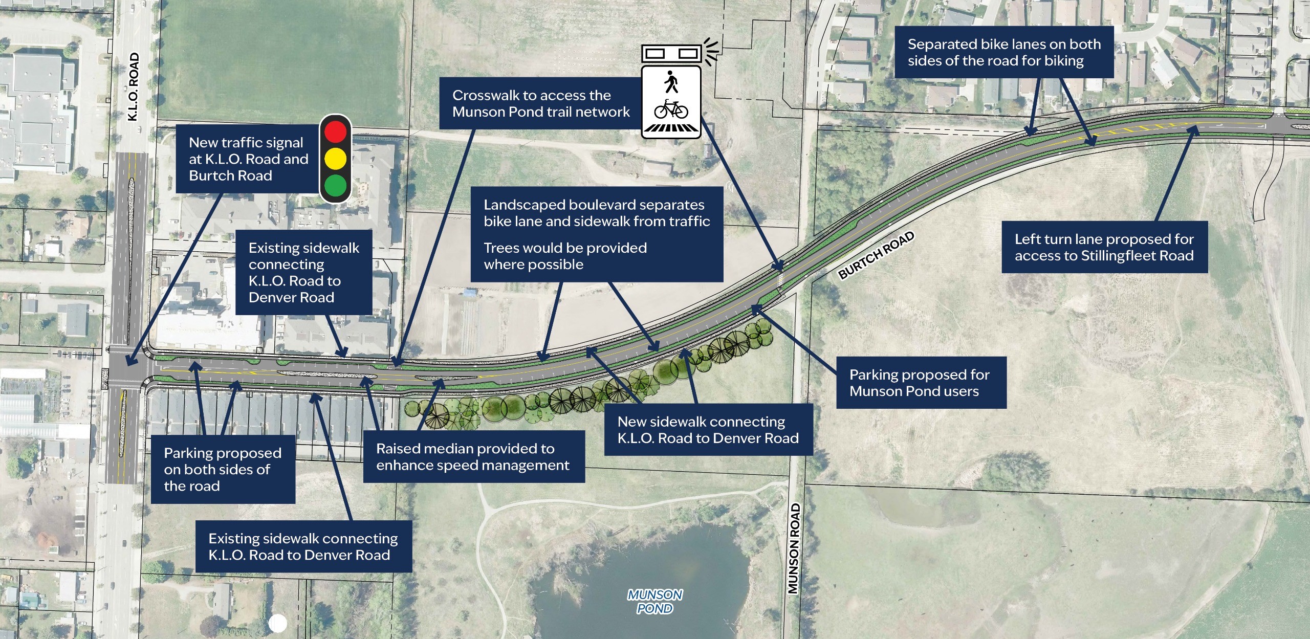 This includes northbound and southbound travel lanes with narrow widths to accommodate increased volumes while managing operating speeds. The project will urbanize the full length of the road, including street trees, protected bike lanes, sidewalks, and a crosswalk to access the Munson Pond trail network. It also includes left turn lanes and intersection improvements where needed, including a new traffic signal at K.L.O. and Burtch, increasing capacity at the existing Byrns Road roundabout. These works are being coordinated with required sanitary sewer infrastructure upgrades.