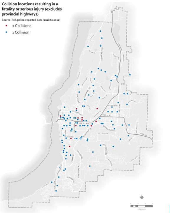 - Jurisdictional Split: Most collisions that resulted in death or serious injury occurred on City‑owned roads, while 38% occurred on provincial highways (Highways 97 and 33).