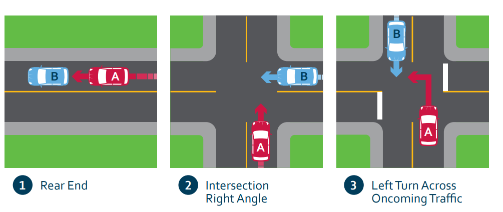 For multi‑vehicle injury collisions, the three most common types, accounting for ~70% of all injury collisions and nearly half of all collisions resulting in someone being killed or seriously injured, include: