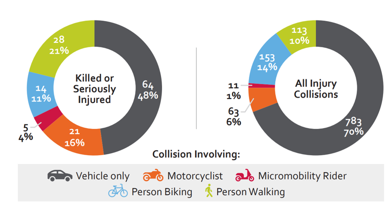 - Vulnerable road users (people walking, biking, or motorcycling) were disproportionately impacted, making up over half of all fatal and serious injury collisions despite representing a smaller share of all injury collisions.